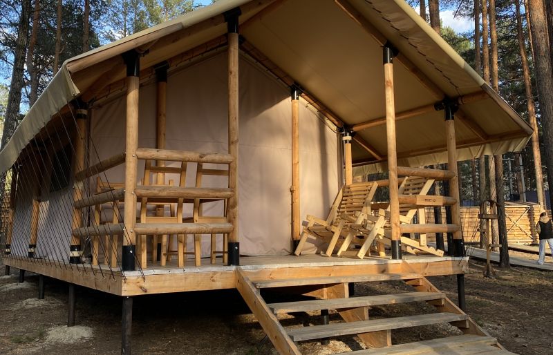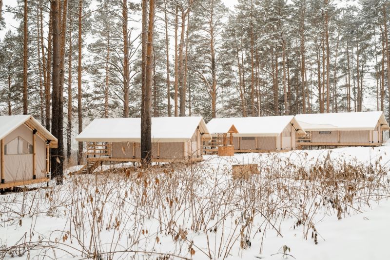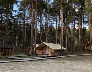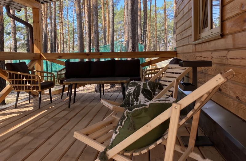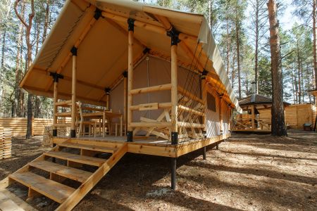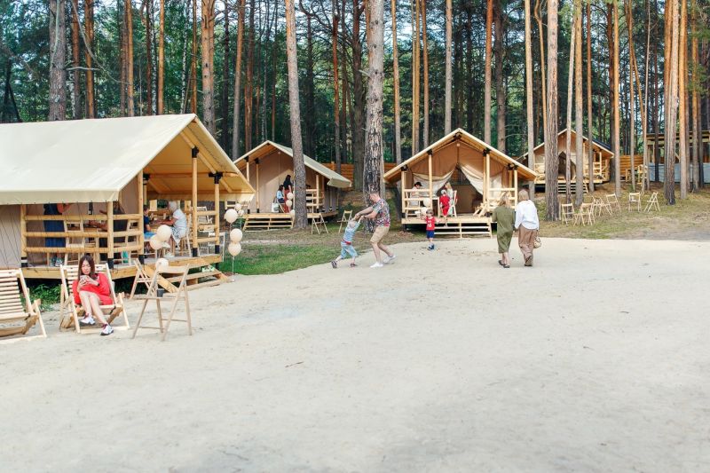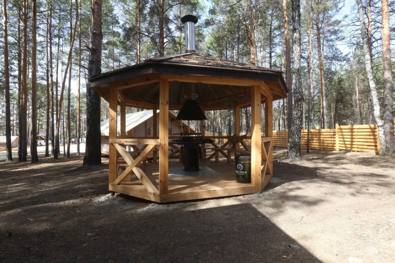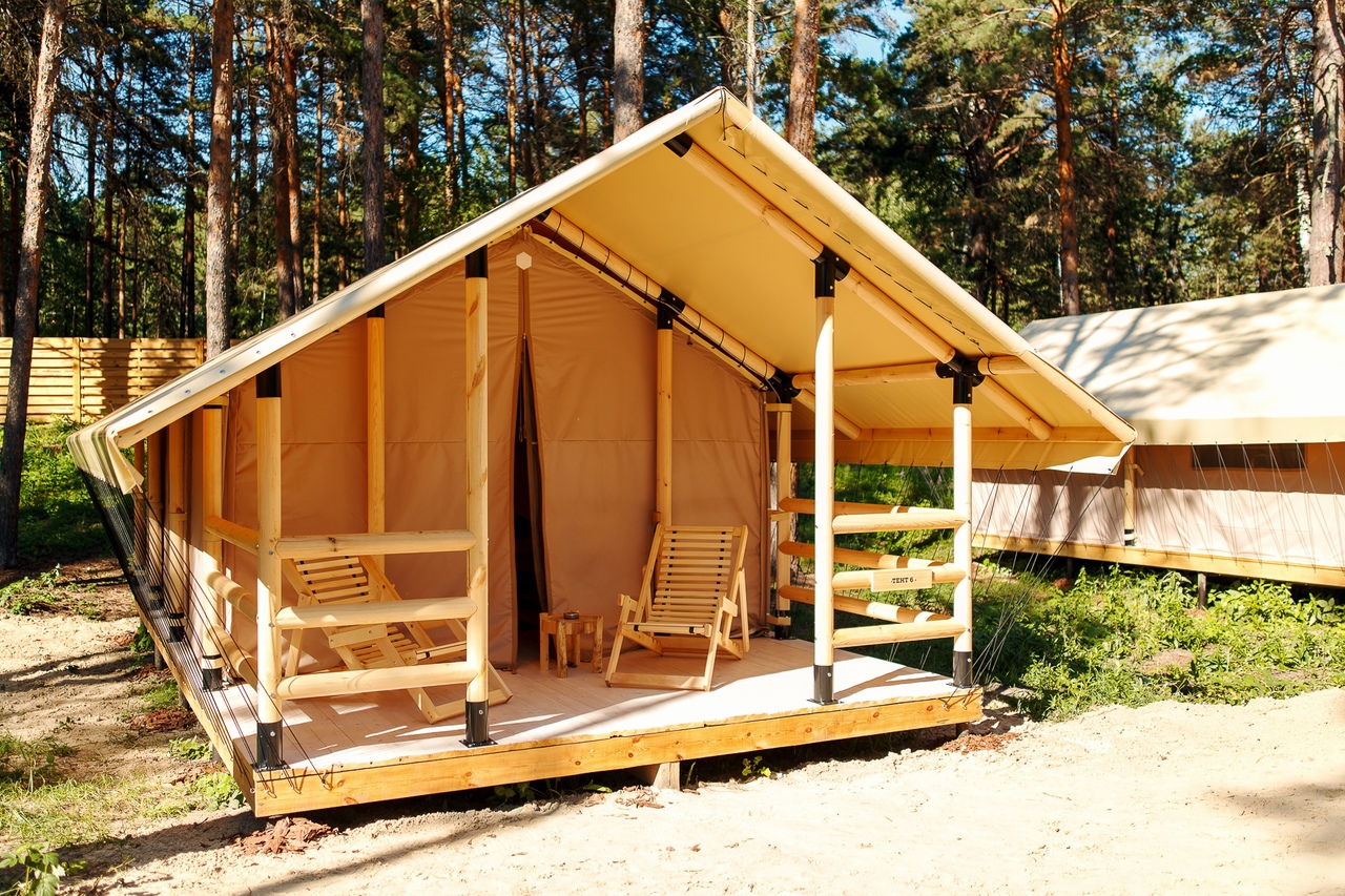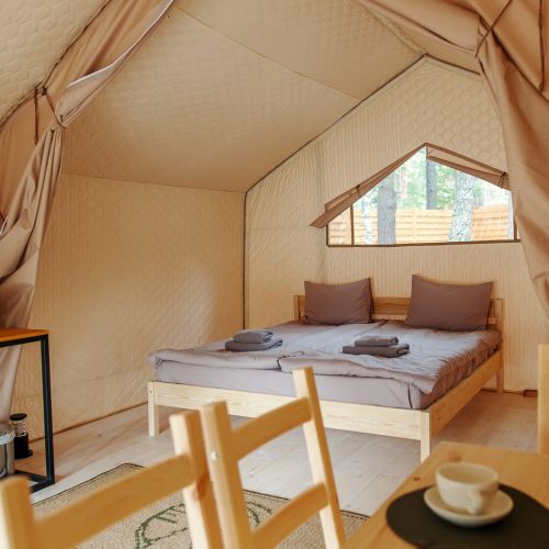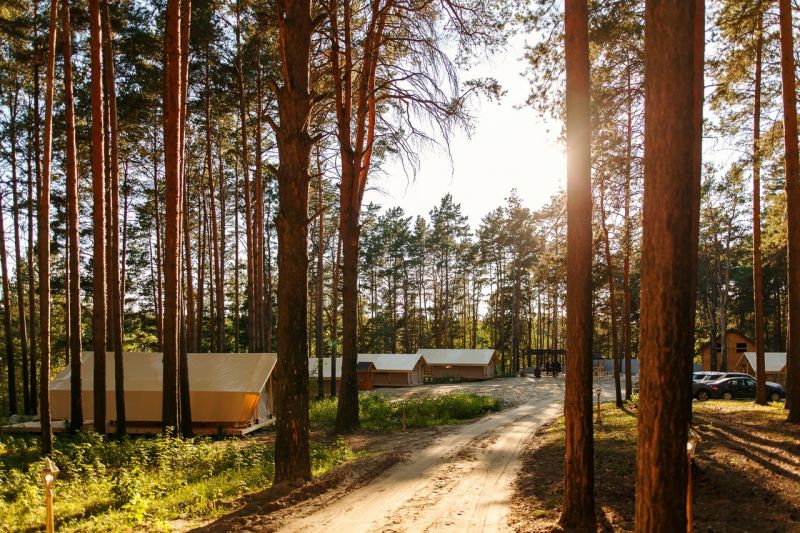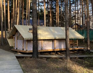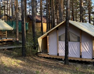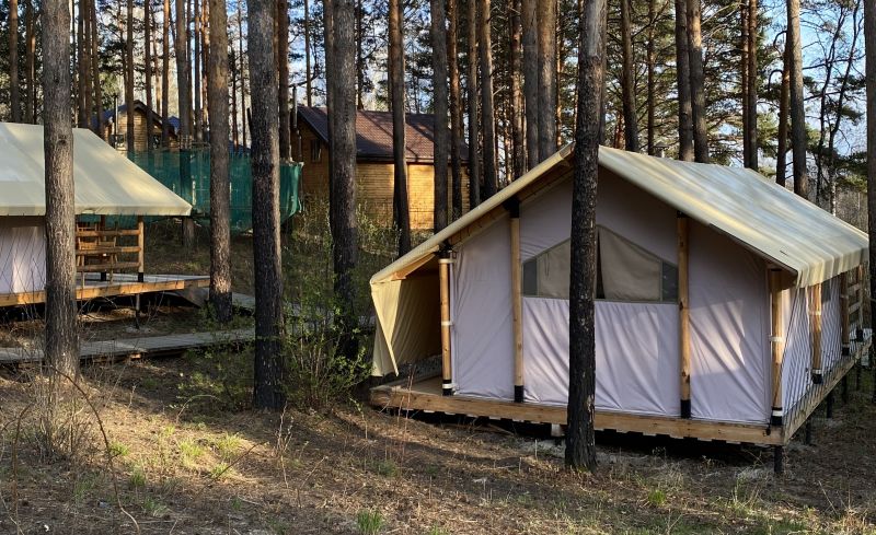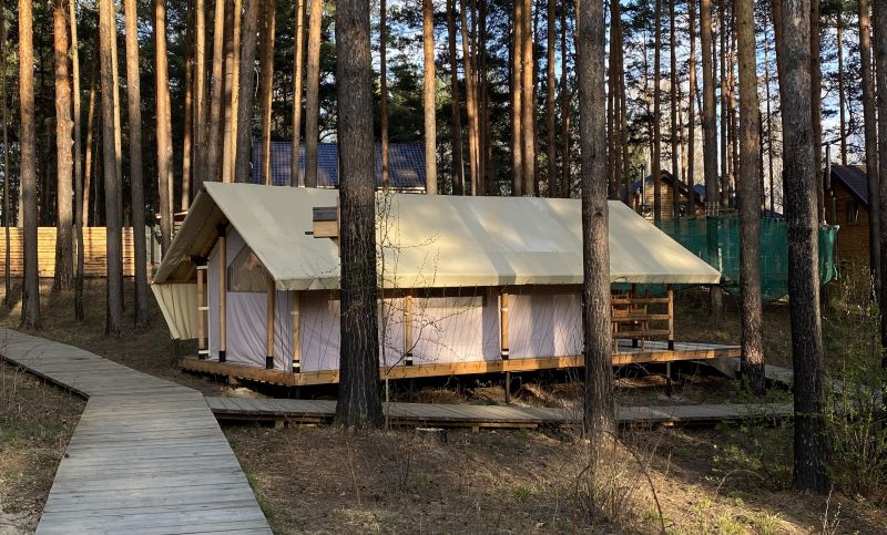 Комплекс отлично для тех, кто любит отдых в условиях дикой природы, но при этом не готов отказываться от удобств. На территории площадью 1 гектар расположились уютные глэмпинги — тенты, вмещающие до 4—5 человек, и комфортабельные двухэтажные дома с банями. Все постройки органично вписываются в окружающую природу, не меняя, а лишь дополняя лесной ландшафт. В каждом глэмпинге — удобные кровати, обеденная зона, проведено электричество, есть чайник и мини-холодильник. Удобства тоже есть — санузел с душем расположены в санитарном блоке. В домах - две спальни, гостиная с зоной отдыха и полностью оборудованная кухня. Помимо бань, в домах имеется и уютная терраса, где приятно встречать рассветы или провожать закаты.