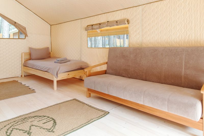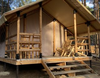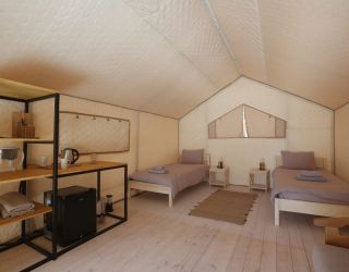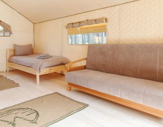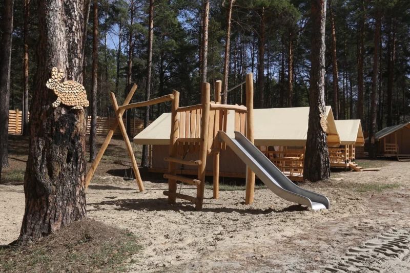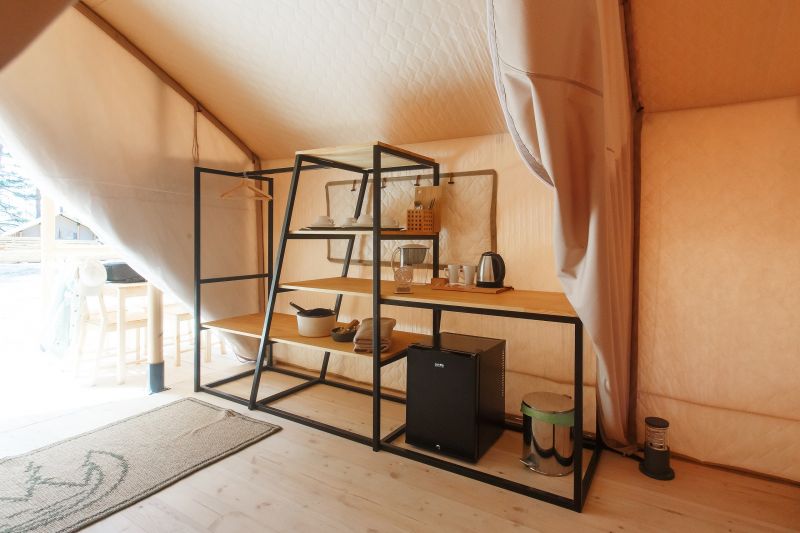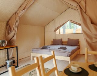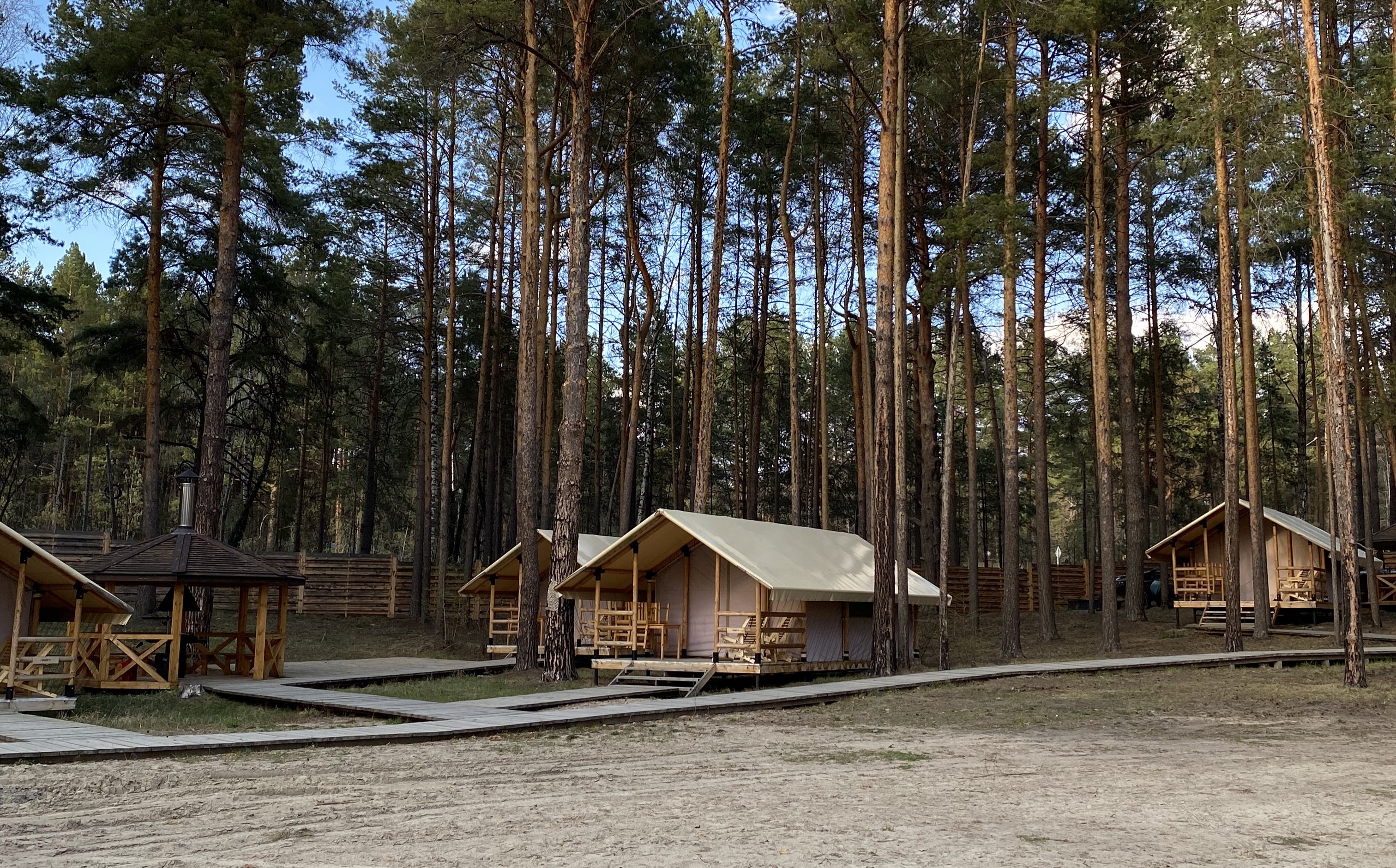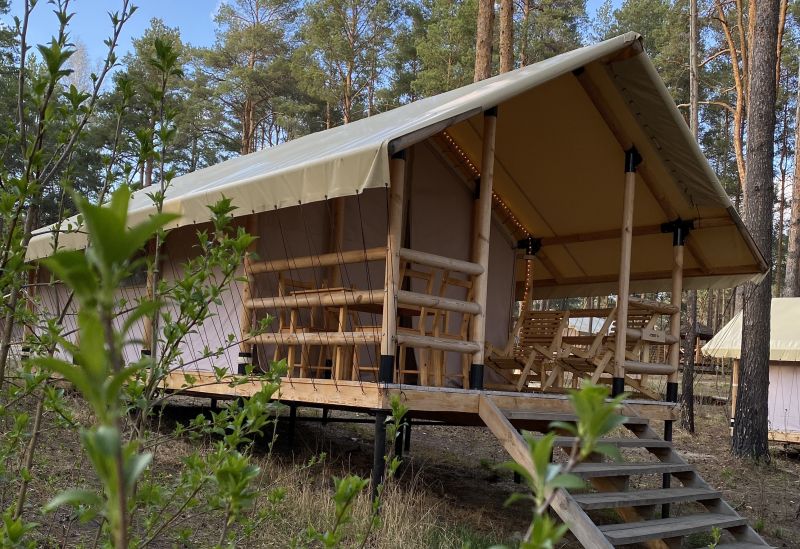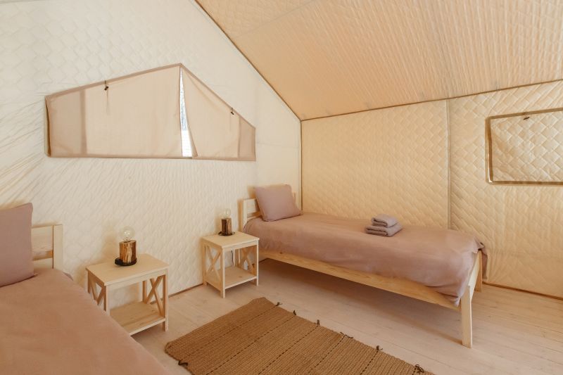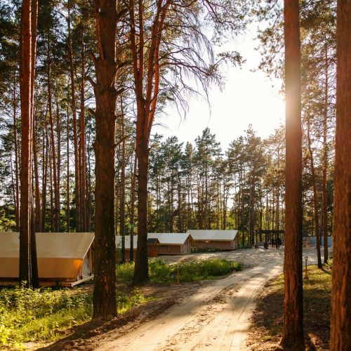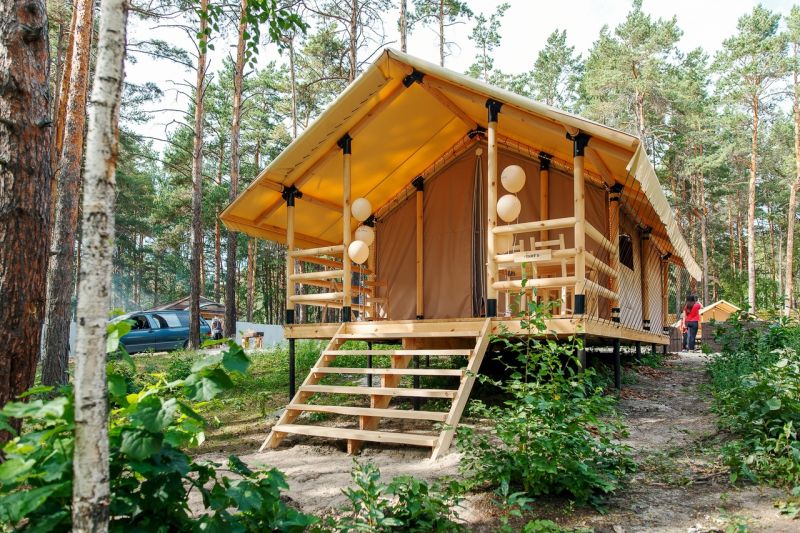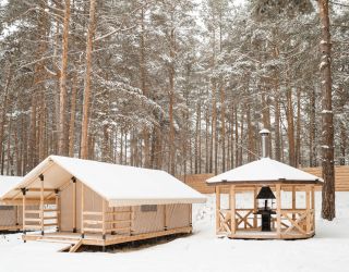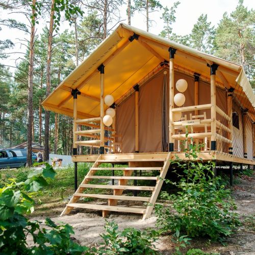 Комплекс отлично для тех, кто любит отдых в условиях дикой природы, но при этом не готов отказываться от удобств. На территории площадью 1 гектар расположились уютные глэмпинги — тенты, вмещающие до 4—5 человек, и комфортабельные двухэтажные дома с банями. Все постройки органично вписываются в окружающую природу, не меняя, а лишь дополняя лесной ландшафт. В каждом глэмпинге — удобные кровати, обеденная зона, проведено электричество, есть чайник и мини-холодильник. Удобства тоже есть — санузел с душем расположены в санитарном блоке. В домах - две спальни, гостиная с зоной отдыха и полностью оборудованная кухня. Помимо бань, в домах имеется и уютная терраса, где приятно встречать рассветы или провожать закаты.
